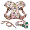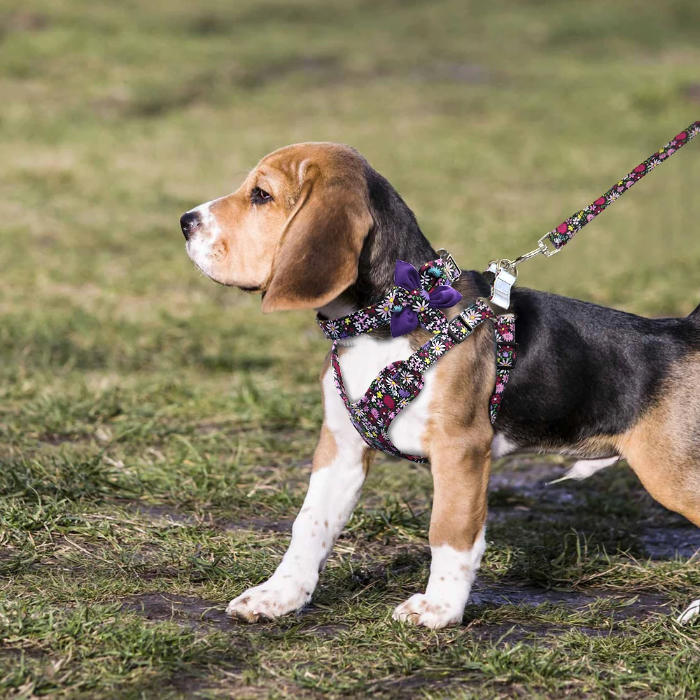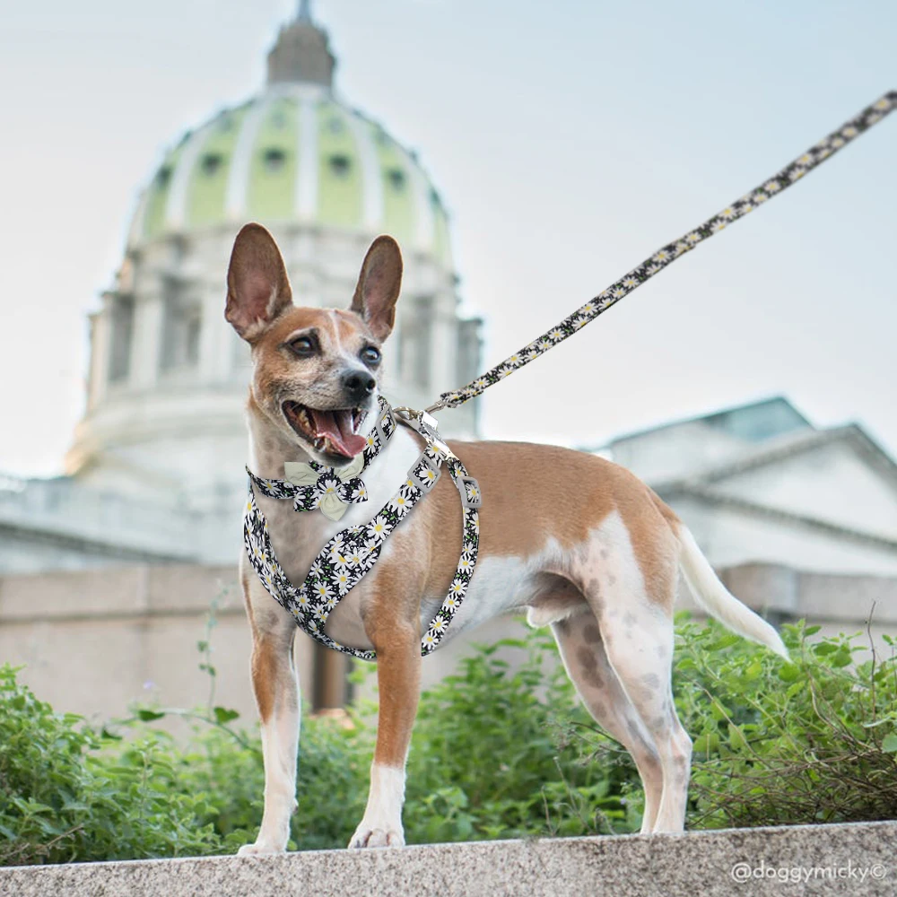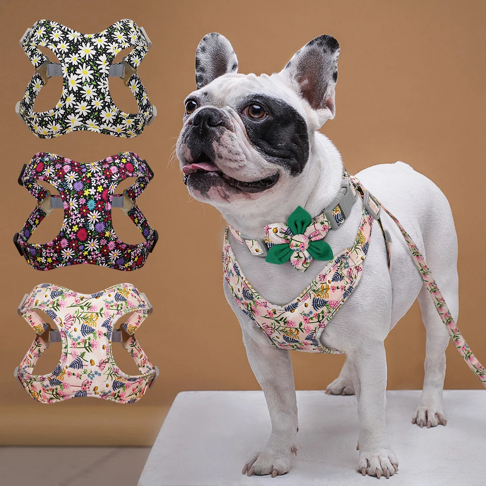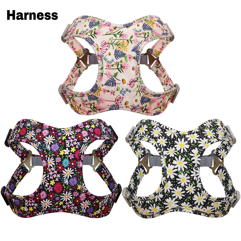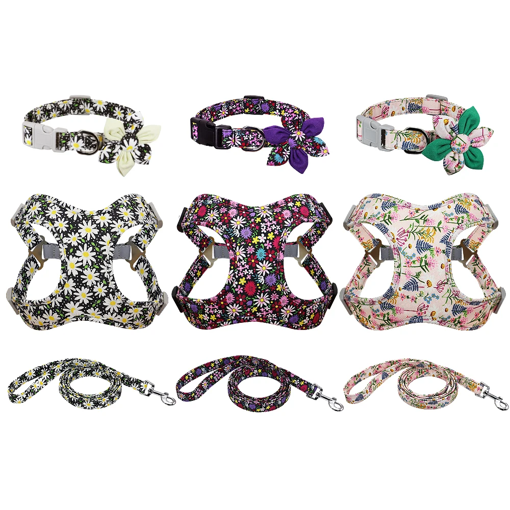 3pcs Dog Collar Harness Leash Set Nylon Dogs Vest Harnesses Flower Print Pet Collar with Lead Leashes With Flower Accessories